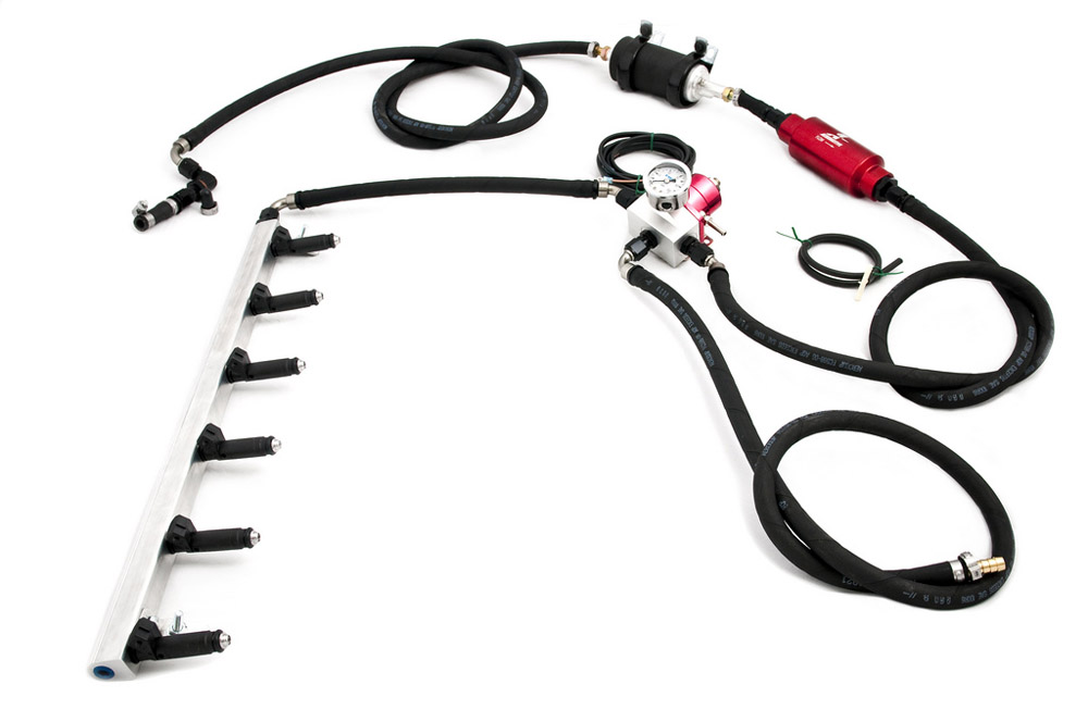 Upgraded Fuel System with LARGER fuel Lines for increase flow rate, CNC machined Fuel Rail, Aeromotive Fuel Pressure Regulator with liquid filled gauge, HI-Volume Walbro inline fuel pump, etc.