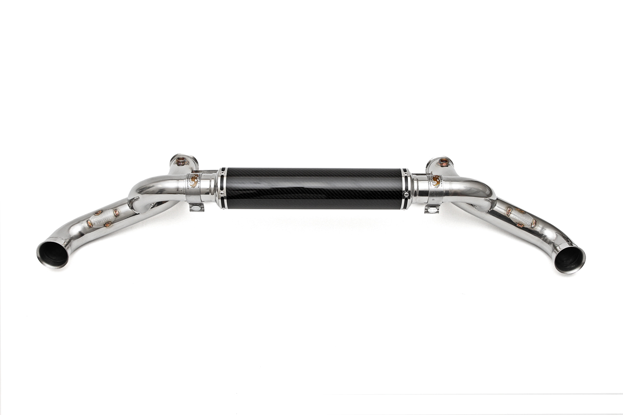 Loud and aggressive performance exhaust system recommended for track use only; replaces the restrictive factory mufflers with a free-flowing resonated design