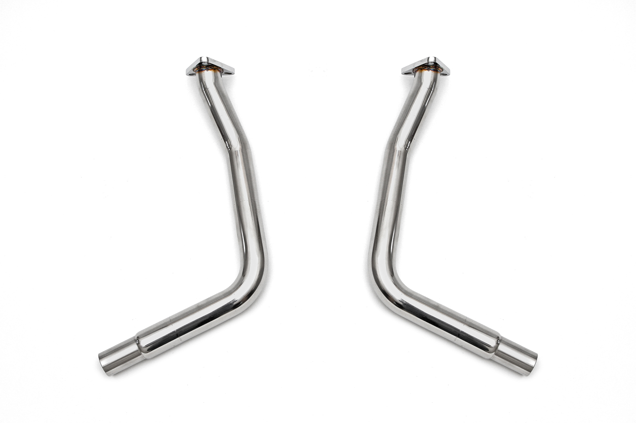 Replaces the restrictive factory catalytic converters with much less restrictive straight-through pipes for maximum flow and performance.